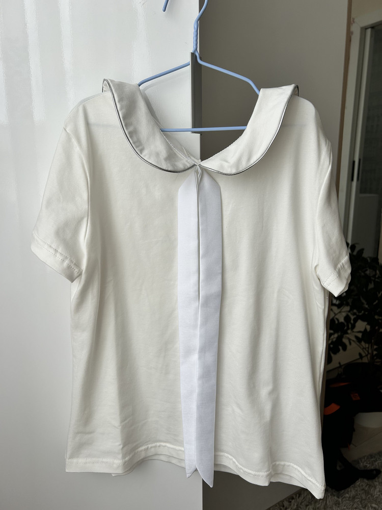 Особое внимание в дизайне уделено пришивному атласному галстуку-банту, который можно завязать в аккуратный бант или носить в распущенном виде для более лёгкого и современного стиля. Вдоль края воротника вшит тонкий декоративный кант с серебряным люрексом, который добавляет изысканный блеск. Классический воротник придаёт изделию завершённый и строгий вид, а застёжка на пуговицу сзади делает надевание удобным и добавляет аккуратный акцент в спинке изделия.